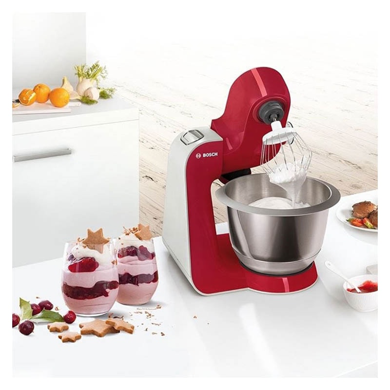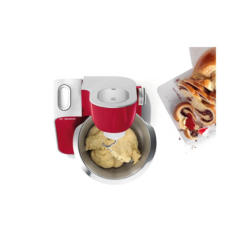 معرفی ماشین آشپزخانه بوش BOSCH MUM58720ماشین آشپزخانه بوش MUM58720 با تنظیمات سرعت 7 حالته و قدرت موتور 1000 واتی، دارای قابلیت همزن، خمیرزن، مخلوط کن، غذاساز، سس زن و … است. این ماشین آشپزخانه چندکاره دارای مخلوط کنی از جنس پلاستیک است که ظرفیت آن حدود 1.25 لیتر میباشد.تیغه این دستگاه از نوع Supercut بوده و از جنس استیل ضد زنگ ساخته شده است.دارای 3 عدد دیسک ( دیسک رنده ریز و درشت) + (دیسک برش ورقه ای نازک و ضخیم) + ( دیسک آسیاب یا خردکن)برای این ماشین آشپزخانه پایه لاستیکی برای ثبات بیشتر طراحی شده و دارای محفظه برای جمع كردن سیم برق است.مجهز به قفل ایمنی درپوش
